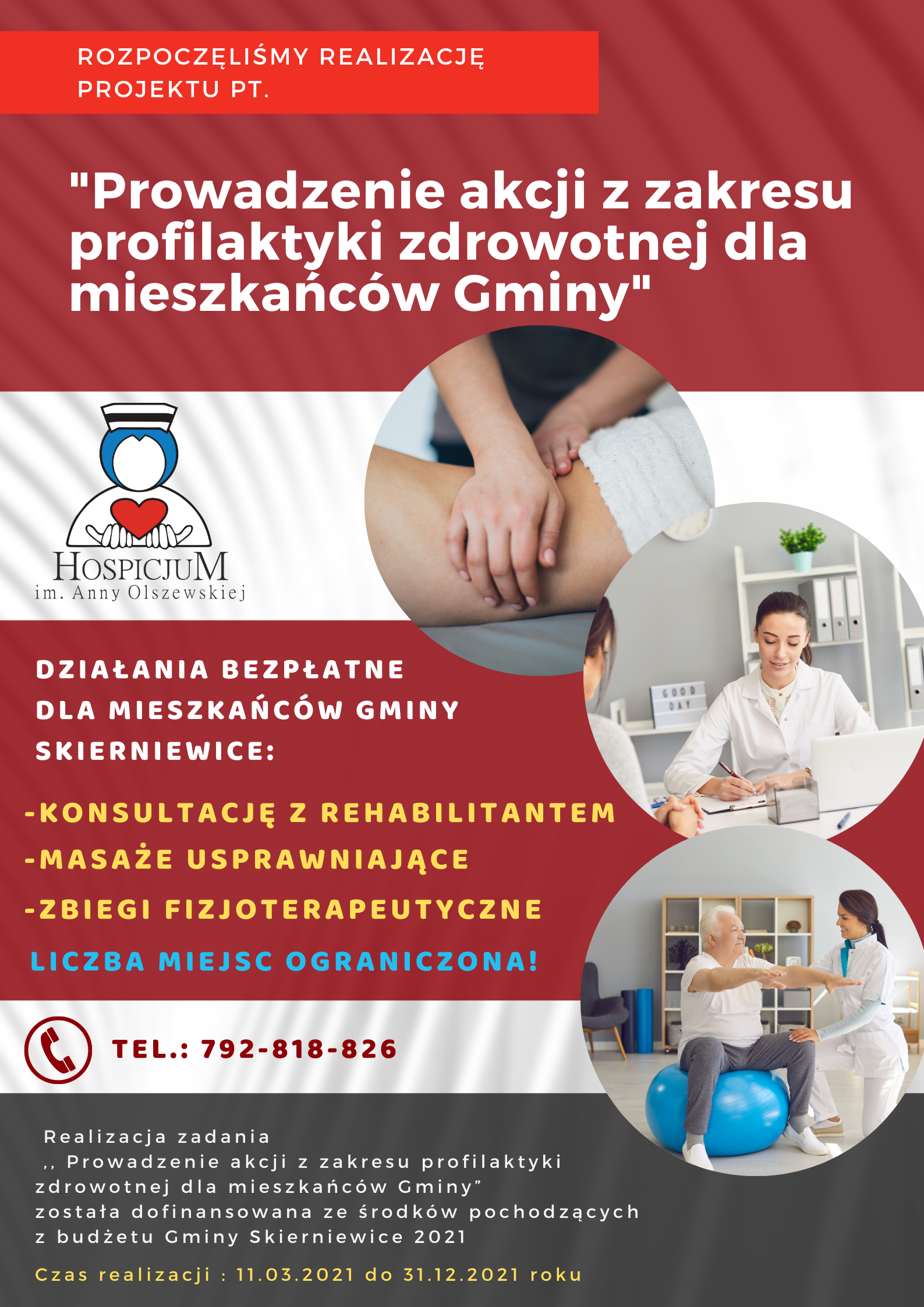 Realizacja zadania ,, Prowadzenie akcji z zakresu profilaktyki zdrowotnej dla mieszkańców Gminy” została dofinansowana ze środków pochodzących z budżetu Gminy Skierniewice 2021.